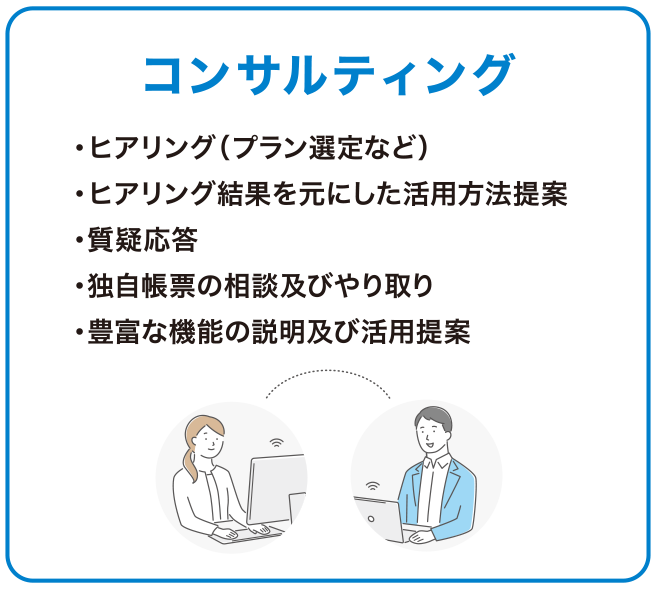 ご多忙でなかなかお試し利用ができないお客様やパソコンに不慣れなお客様向けに、導入から運用までアドバイザーが導入の一切をお引き受けし、使い方のレクチャーまでついた「まるごと支援パック」もご用意しております。ご希望のお客様はお気軽にご相談くださいませ。