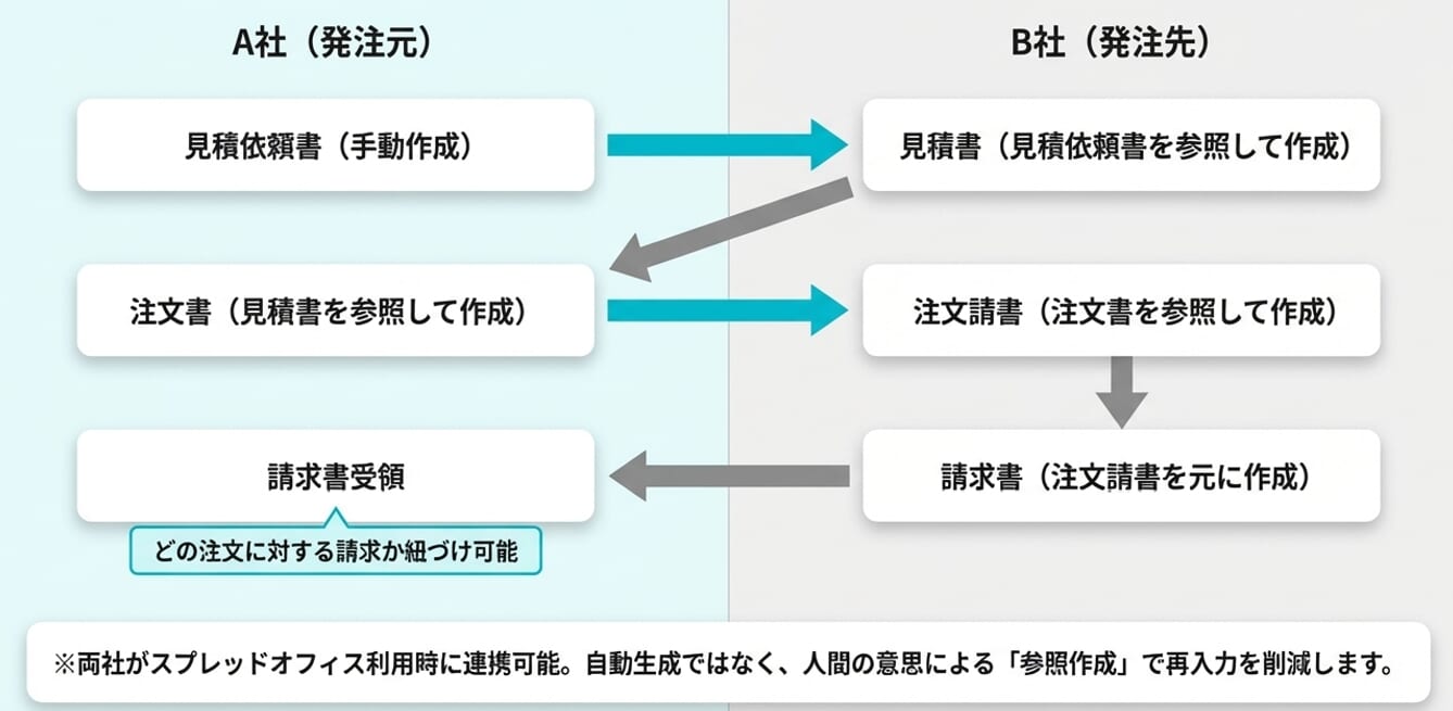 発注元(A社)と発注先(B社)の両社がスプレッドオフィスを利用することで、分断されていたファイルは「繋がるデータ」へと進化します。