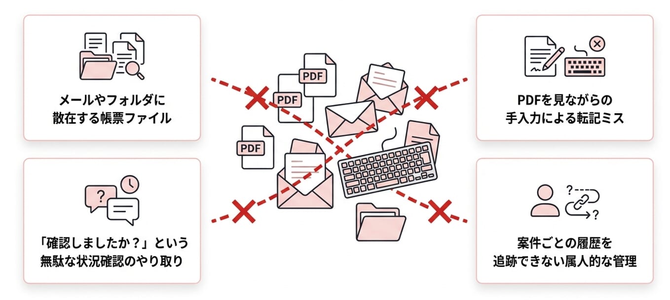デジタル化が進んでいる現代でも、多くの現場では帳票が「データ」として繋がっておらず、以下のような非効率が発生しています。