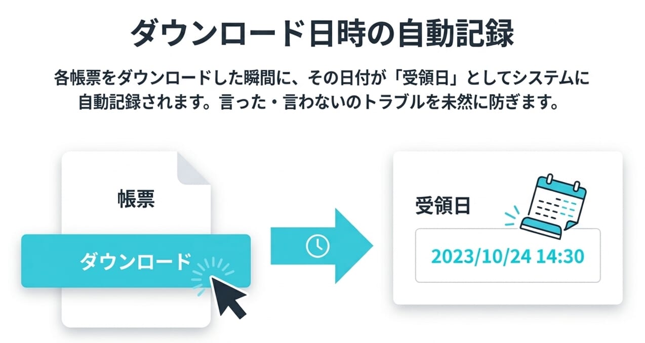 受領確認の自動化: 相手が帳票をダウンロードした瞬間に、その日付が「受領日」としてシステムに自動記録されます。これにより、電話やメールでの到着確認が不要になります。