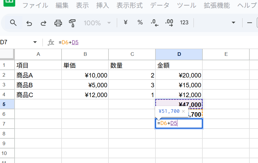 =D5+D6と入力します。- これで、小計と消費税が足され、最終的な請求金額「¥51,700」が算出されます。