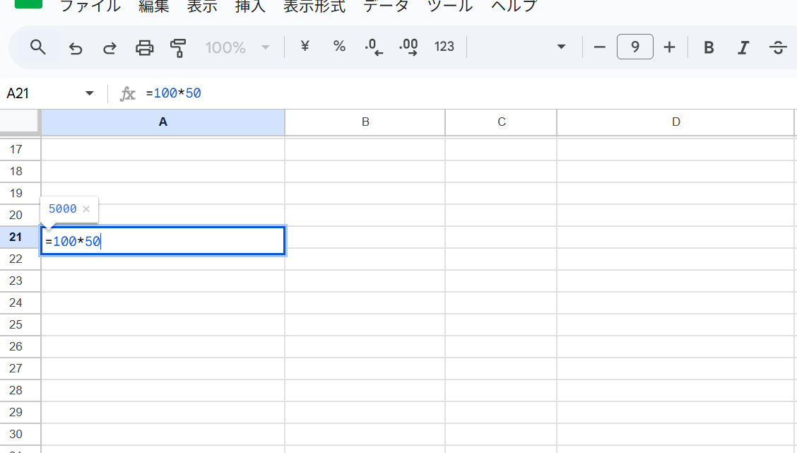 このように、100×50を計算したい場合は