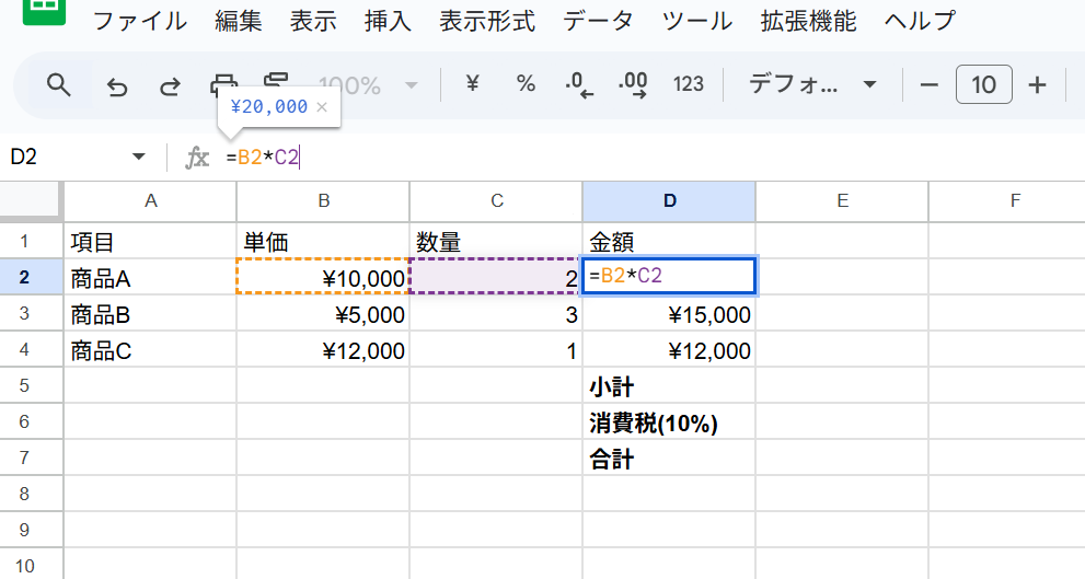 - 「商品A」の金額セル(D2)に、