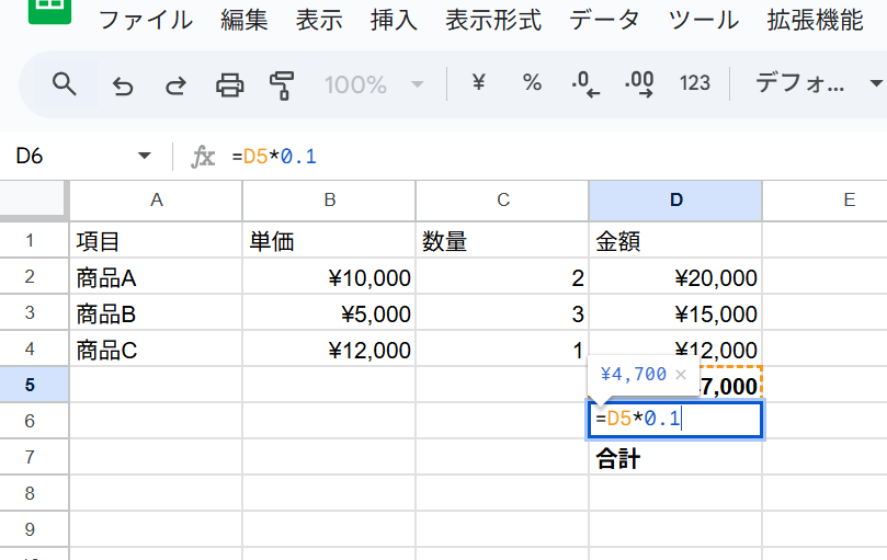 =D5*0.1と入力します。D5は小計のセルです。これにより、¥4,700が計算されます。
