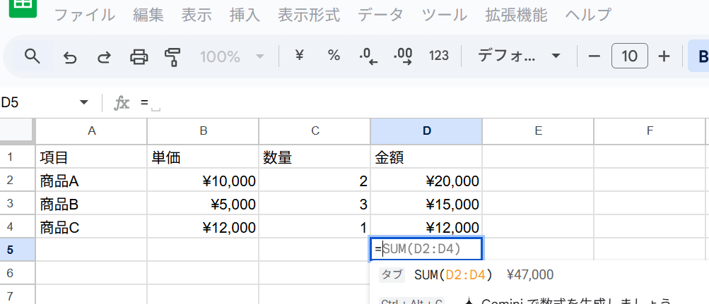 =SUM(D2:D4のように、自動で範囲が入力されます。 - 最後に