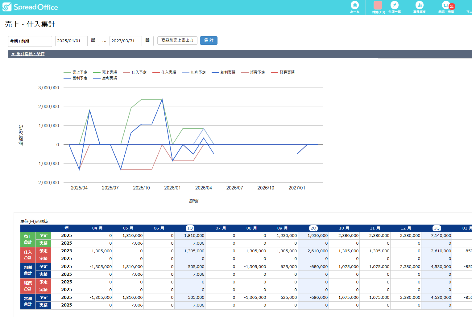 • SpreadOfficeの解決策: 日々の見積・発注・請求のデータがそのまま「売上仕入集計レポート」に反映されます。