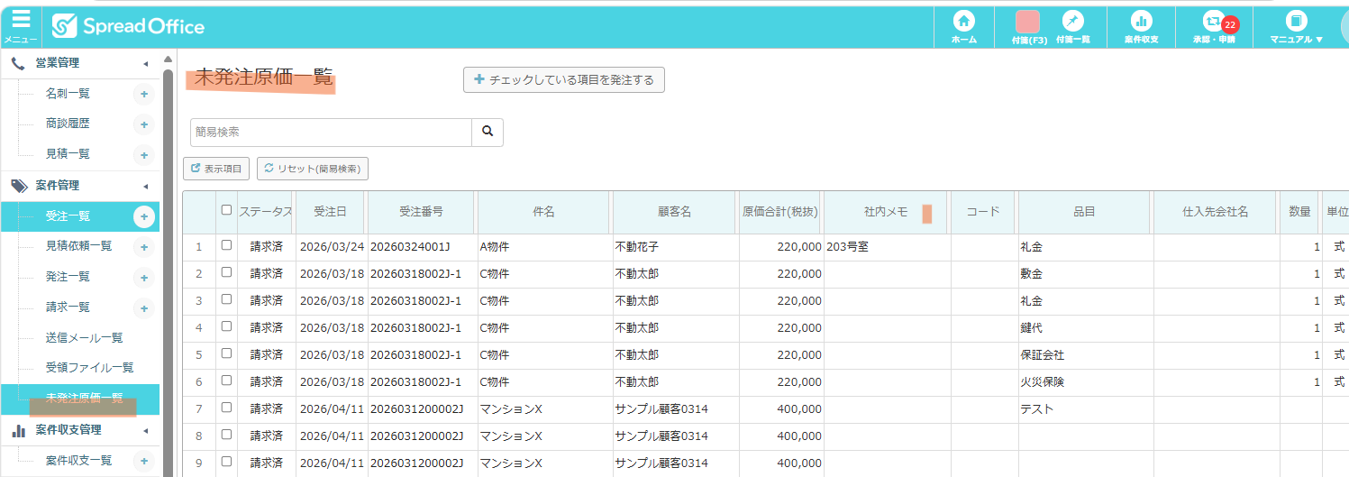• SpreadOfficeの解決策: 「未発注原価一覧」を見れば、まだ動いていないお金がひと目でわかります。これは「預り金」をどう精算すべきかの道しるべになります。