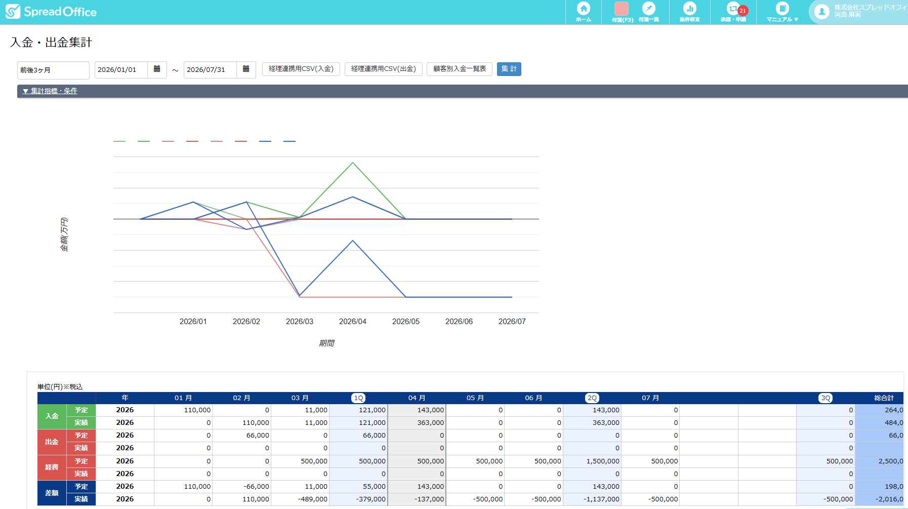 • SpreadOfficeの解決策: 請求書の発行日や支払い期日に基づき、「入金・出金予定」が自動で集計されます。