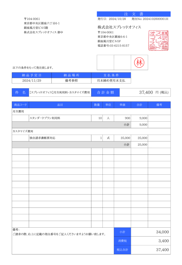 スプレッドオフィスを使えば、システムに必要事項を入力するだけで、下請法の要件を満たした正確な発注書を自動で作成できます。